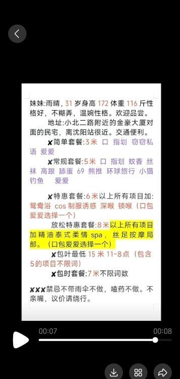 站长提醒:参考如下攻略防范骗子 1、所有没有见到面就提前要求付款(索取定金、红包、路费、保证金等)的都是骗子! 2、进入场所后没有提供具体服务就一直推荐办卡,并且对服务项目含糊其辞的都是骗子! 3、所有在帖子或者回复中出售VIP、楼凤联系方式等的都是骗子 4、如果你加上了骗子的微信或QQ,请在删除之前先举报一波 ※微信、QQ搜索异常属于正常现象,加的人越多越容易被限制。如若联系方式全部失效的,请在下方留言,会有工作人员审核后,退还金币。